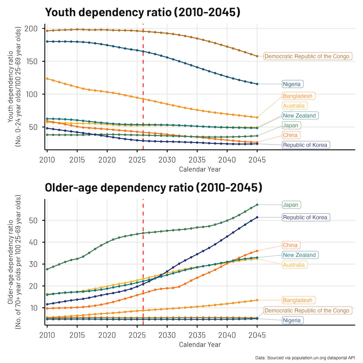 Here is the final plot we came up with. It shows the ratio of Youth (0-24 year olds) and Older-age folk (70+ year olds) to ‘working age’ (25-69 year olds) folks for a range of (selected) countries, across a 35 year period (2010-2045).