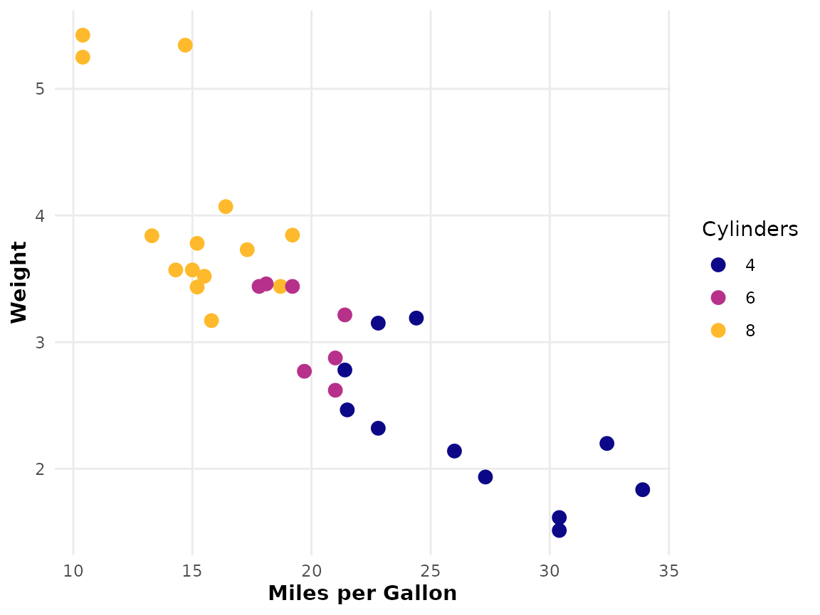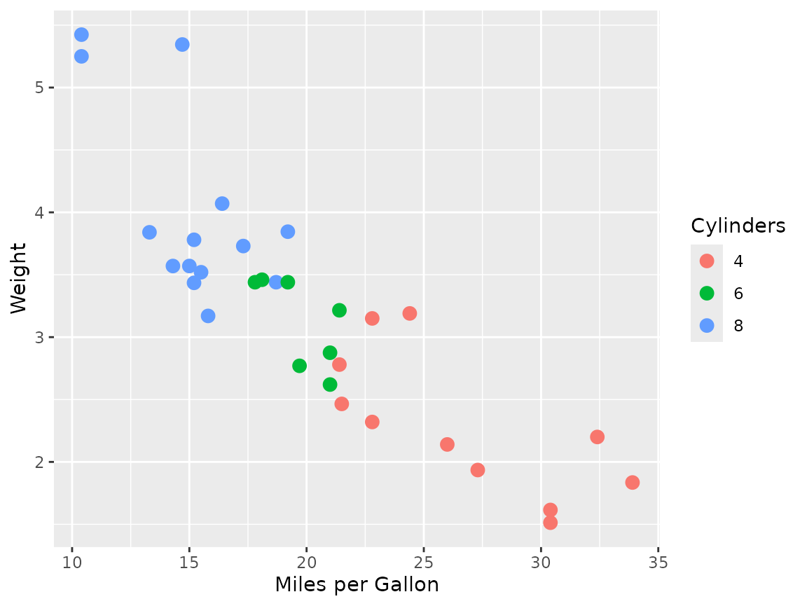labs(x = "Miles per Gallon", y = "Weight", col = "Cylinders")